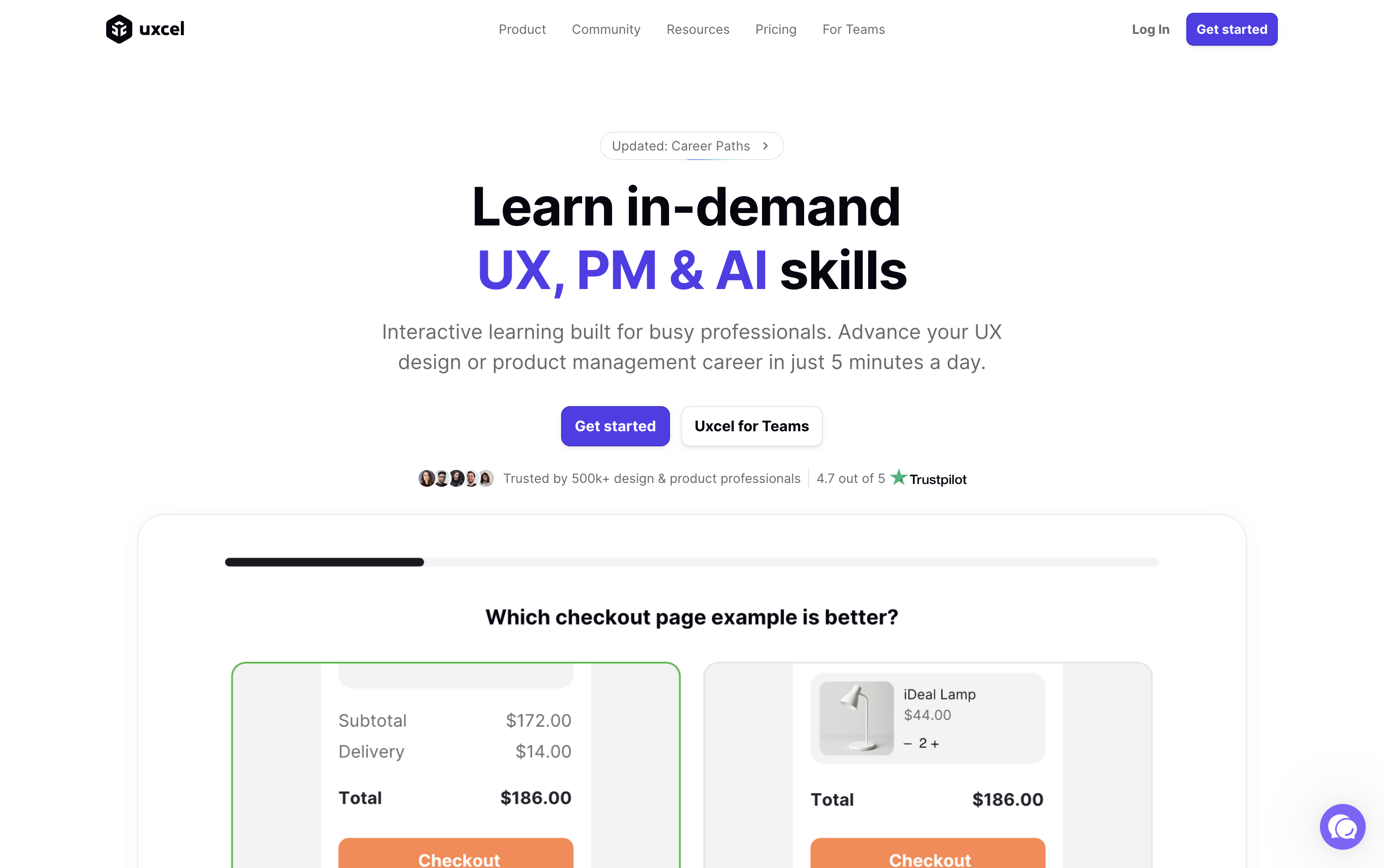 Uxcel changes how people learn UI/UX design. It has courses, interactive learning, skill tracking, a community, and a mobile app.